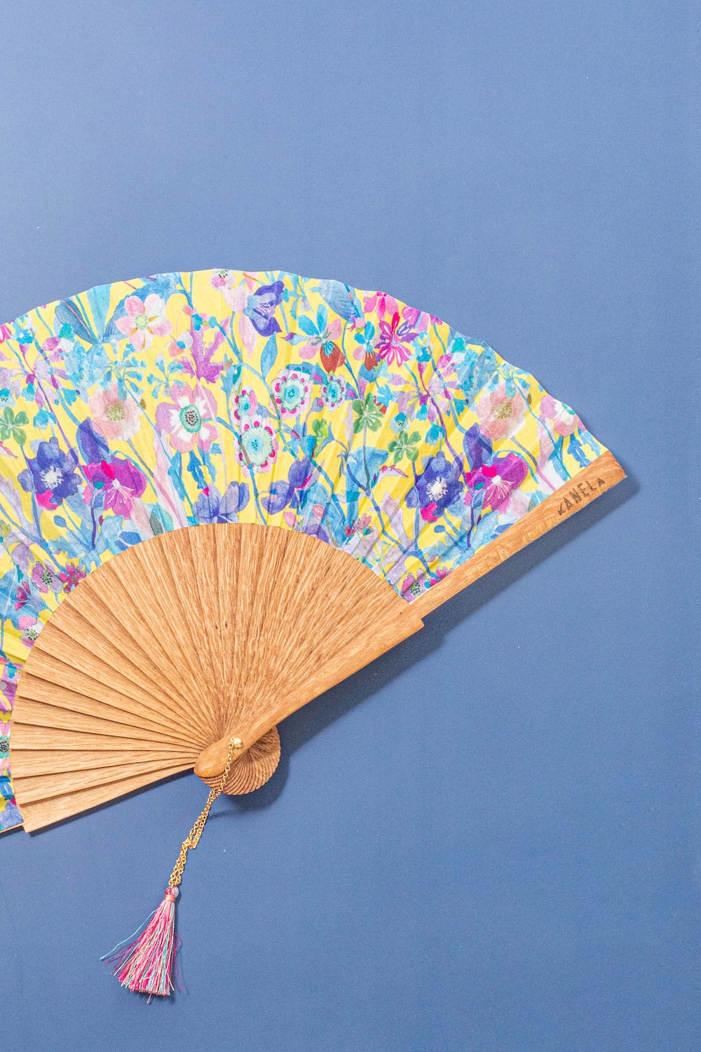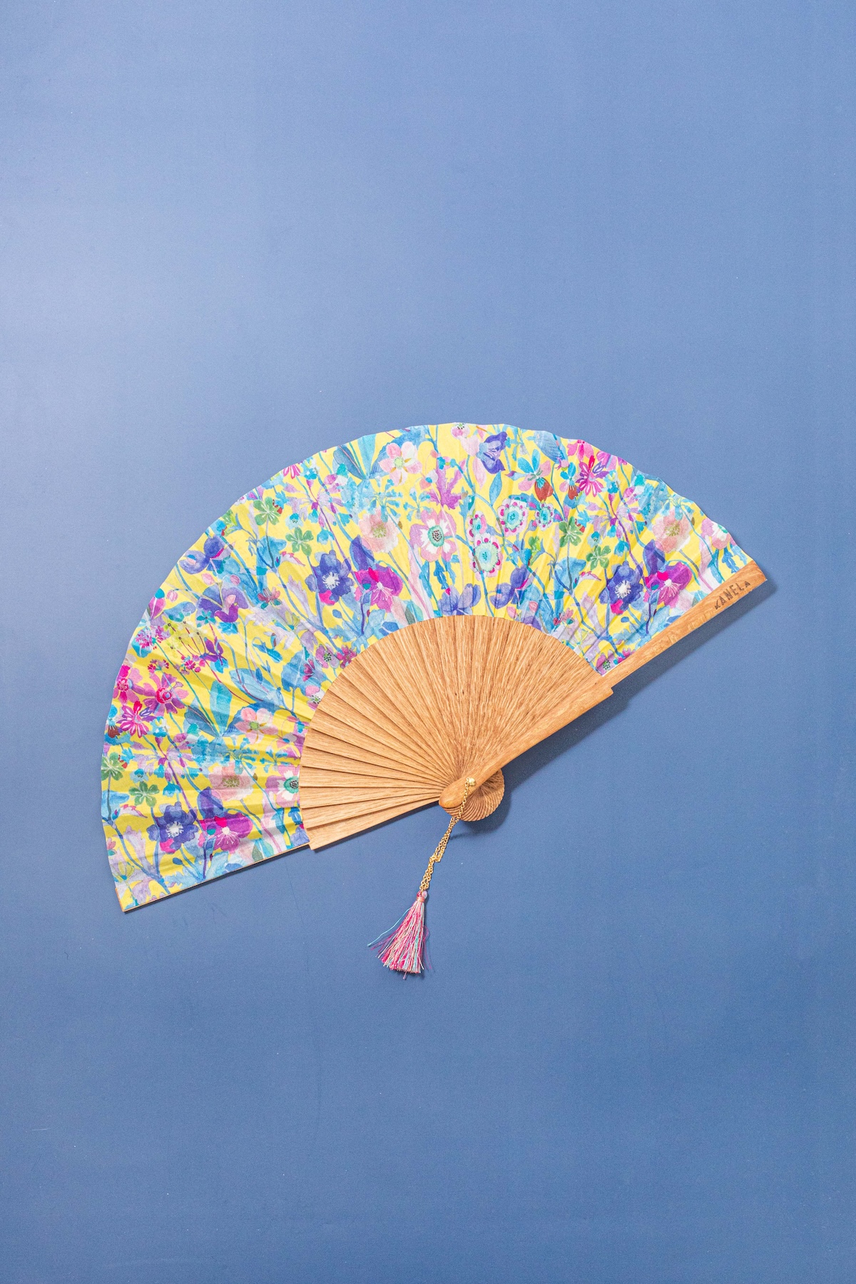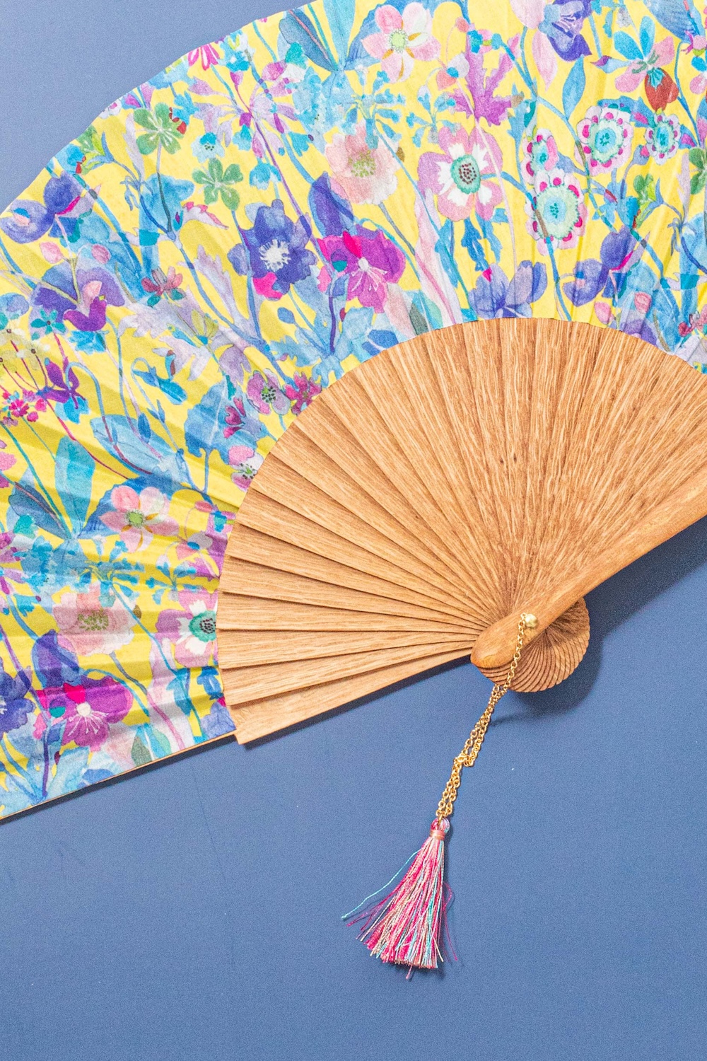 Fan made of limba wood, with 100% cotton printed fabric. Pom-pom detail with chain.